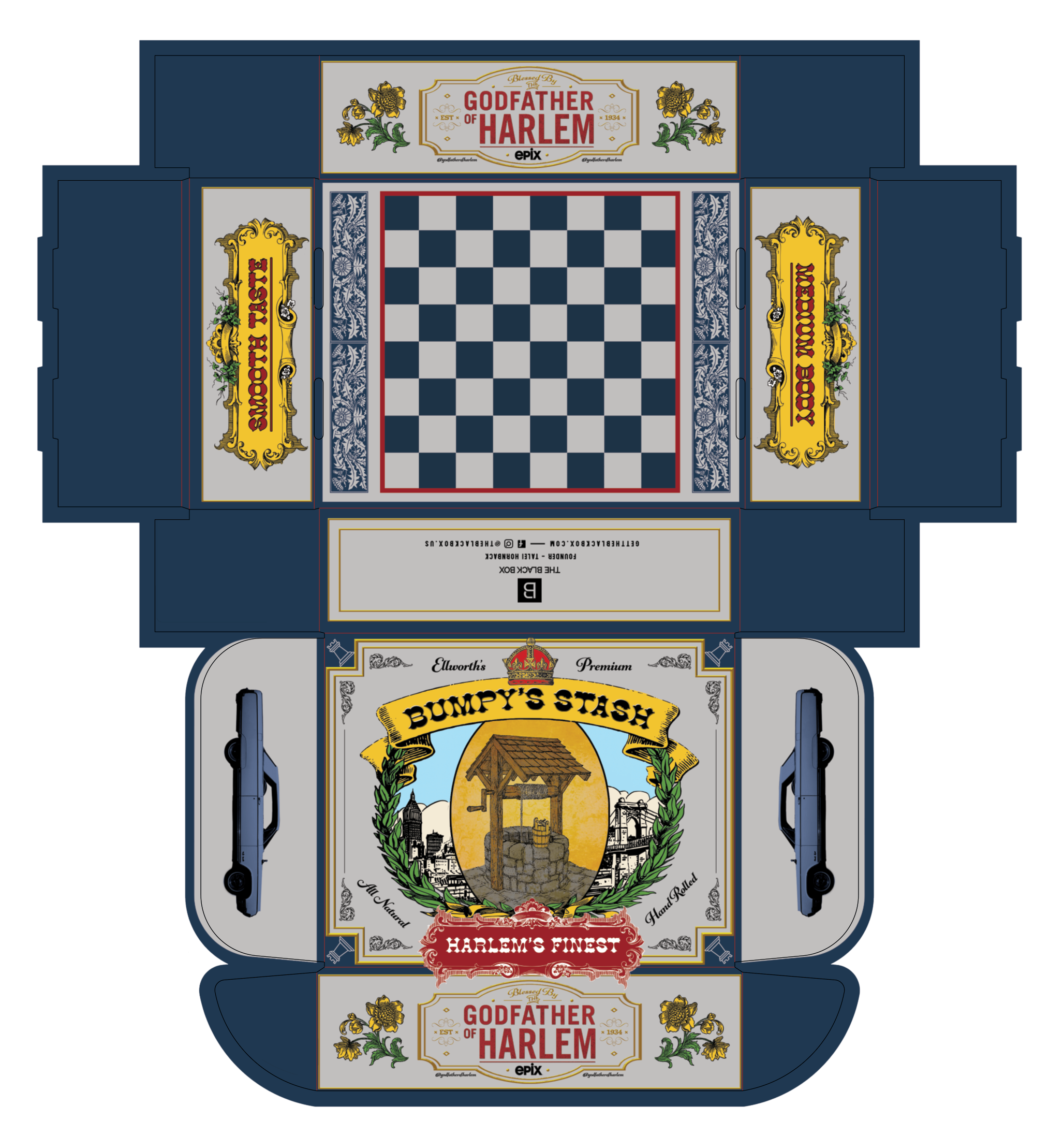Drawing on his influences, history, hobbies, and persona, the box was designed with details and Easter Eggs that devoted fans would appreciate. Modeled after old cigar boxes, we presented “Ellsworth’s Premium” items, “Harlem’s Finest.” The first nods to the icon, paired with a king’s crown, referencing Bumpy’s leadership and the game of chess. Chess pieces became filigree on the exterior, but that was just the beginning.