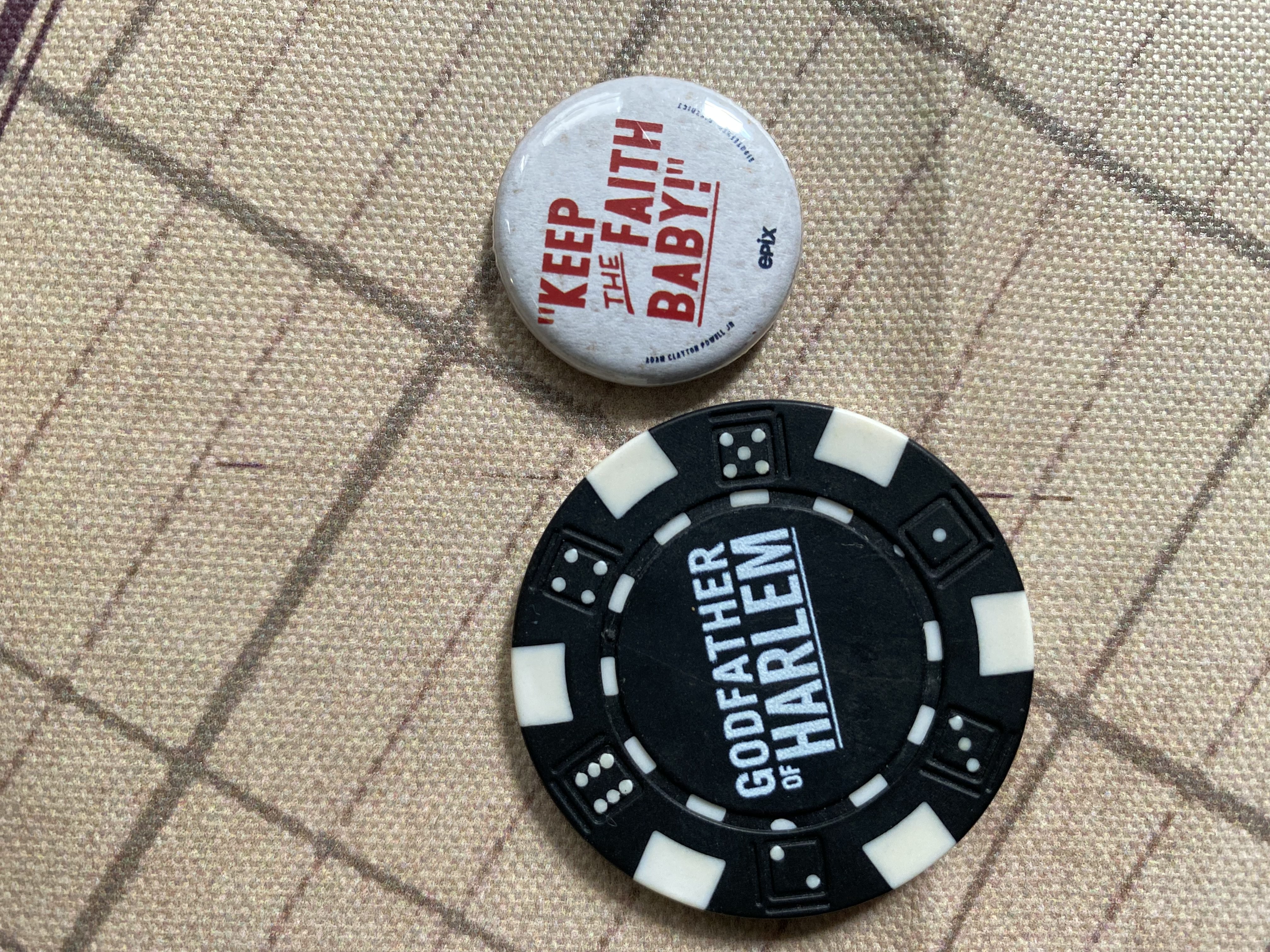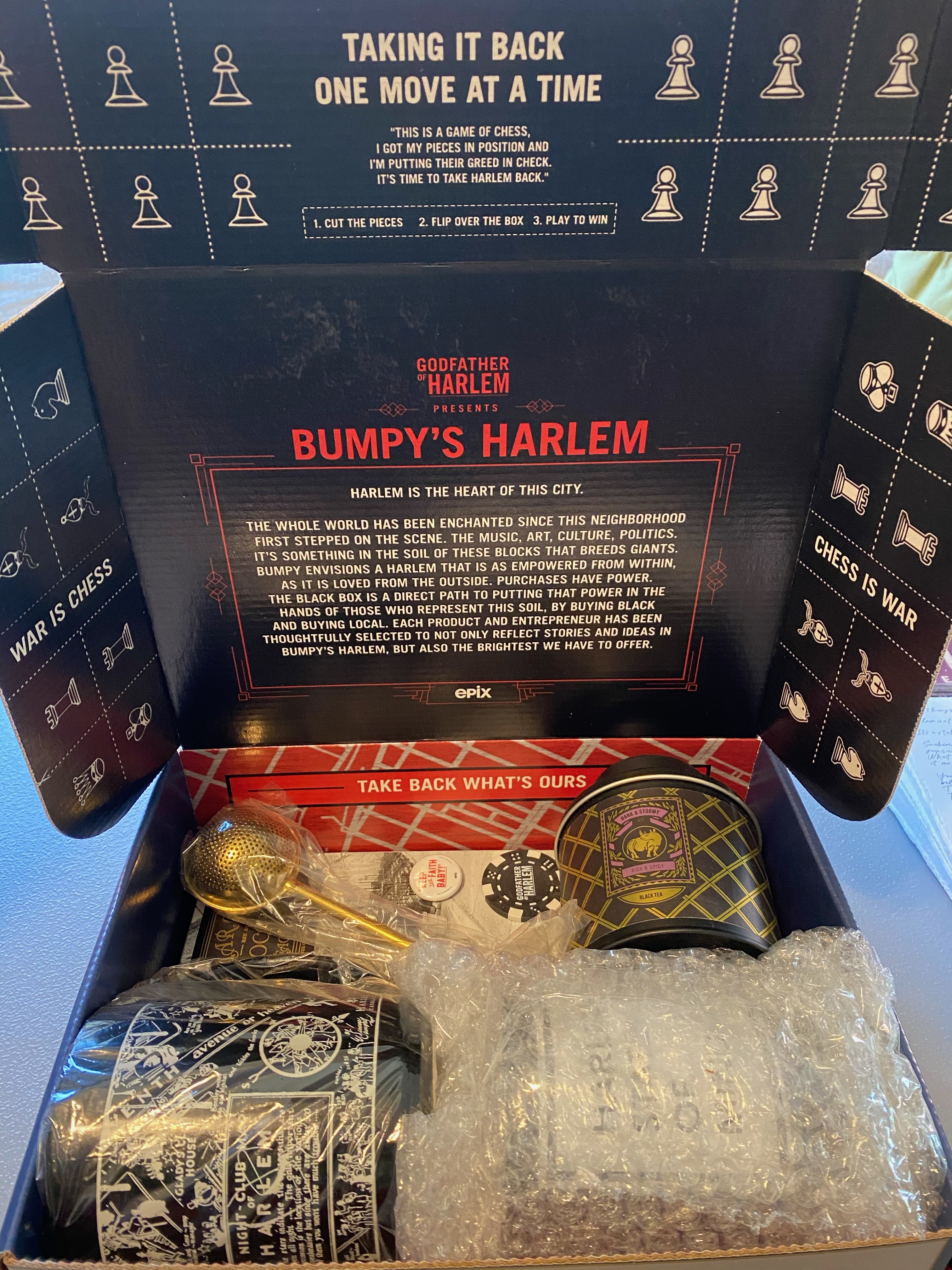 The contents were equally intentional. They extended beyond Bumpy, connecting to the ongoing fight he and his entourage championed. A handwritten thank you letter from Bumpy stressed that “Harlem is a state of mind...” and “...we’re just getting started.” A reminder to “Always bet on black” echoed across Bumpy’s note, as the tagline on a stylized limited-edition mini poster, and with a branded black poker chip. And a political button from Adam Clayton Powell’s campaign, sporting his famous slogan, invited people to “keep the faith” while supporting the cause.