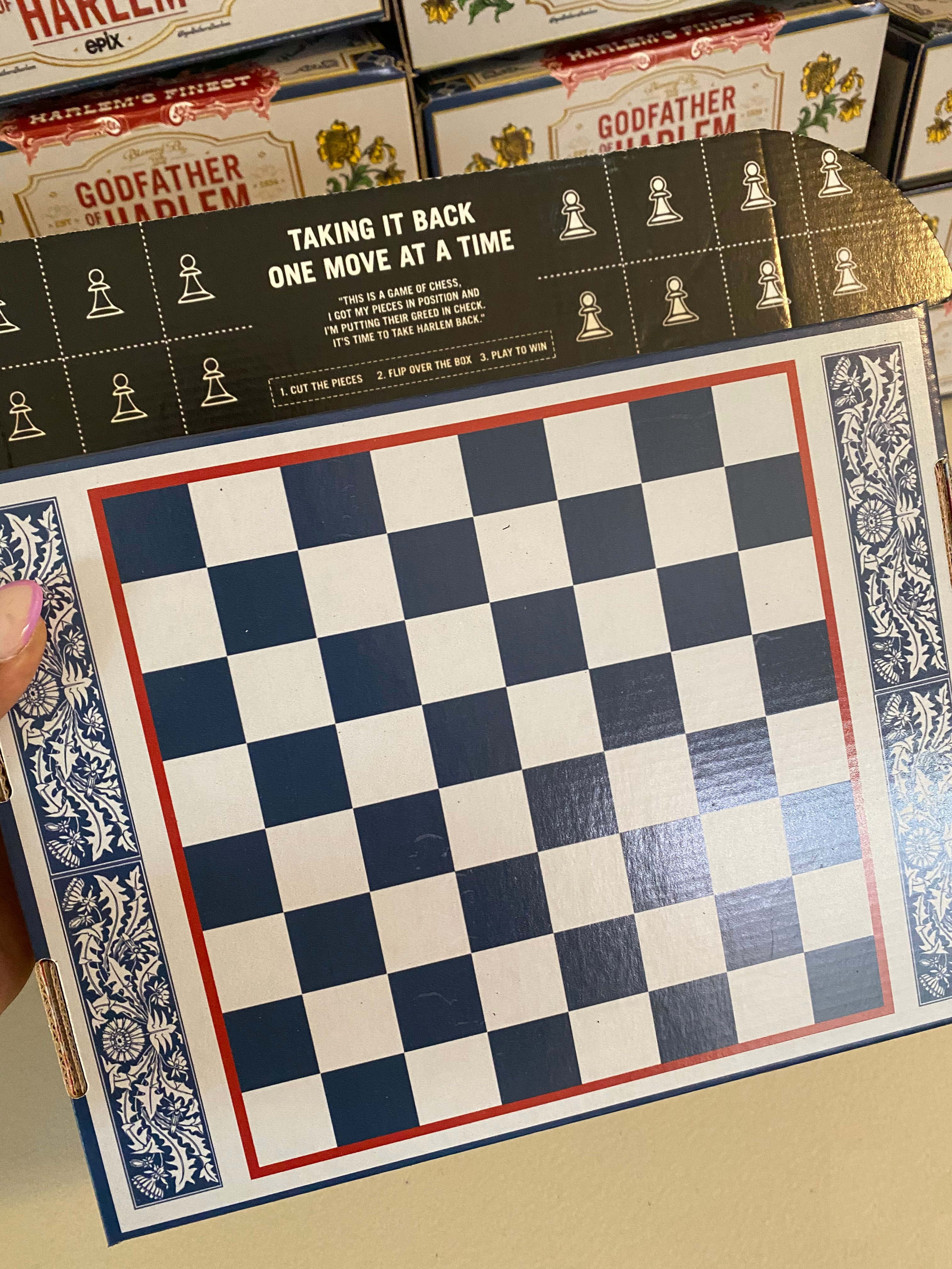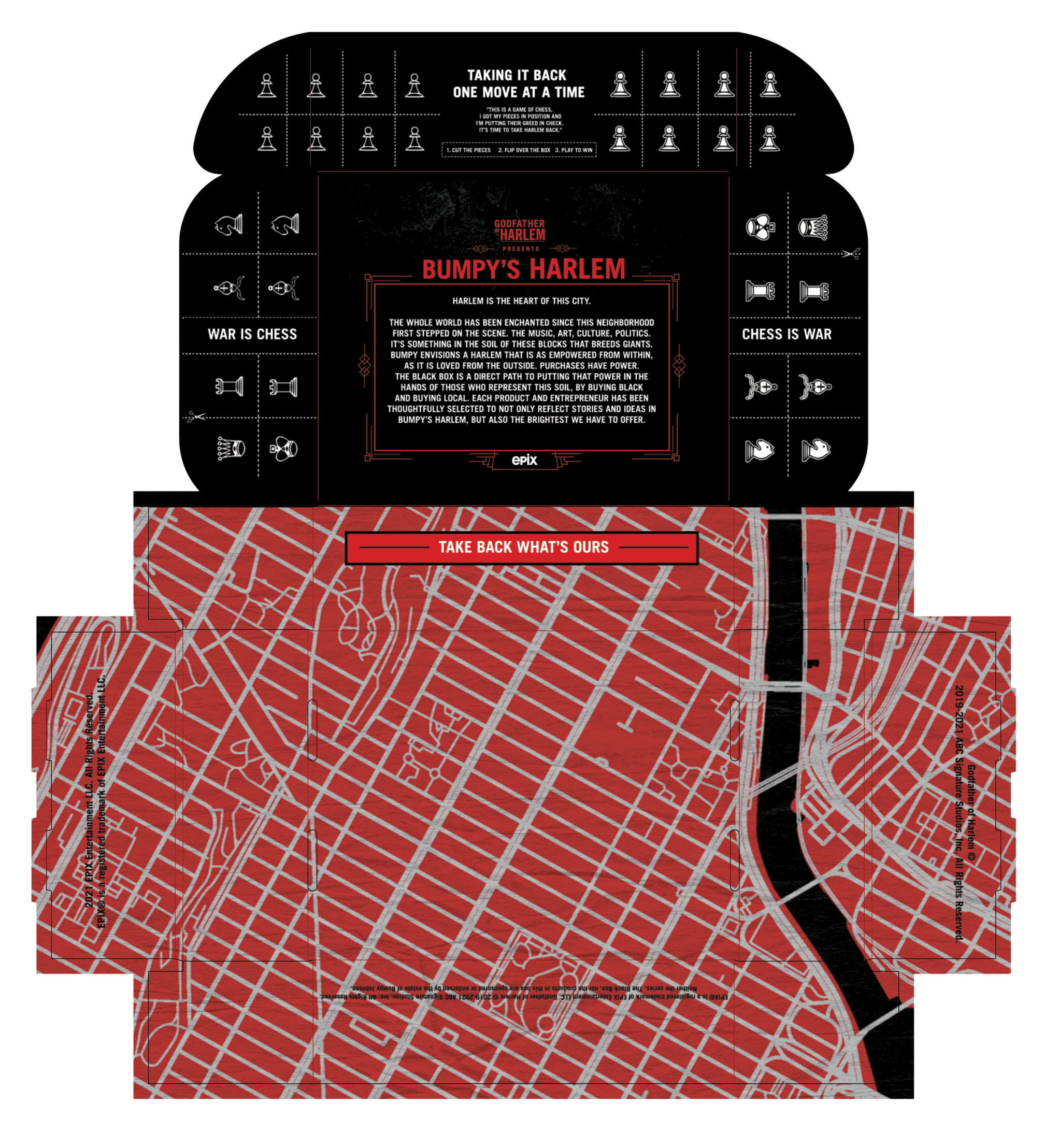 Inside, a full set of cut-out chess pieces could be used to play a game on the beautifully designed chessboard featured on the back of the box. The interior, covered in a map of Harlem, challenged people to join Bumpy’s cause, featuring the rallying cry “TAKE BACK WHAT’S OURS,” while prominently displaying a manifesto from Bumpy himself just above it.